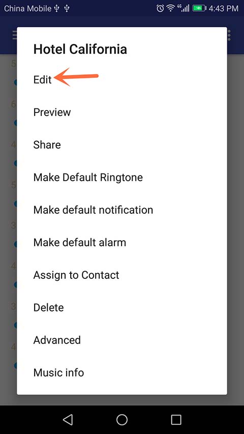 Step 1: After opening the application,you should see a list of audio files present on your android device as shown below. Now, tap the navigation bar next to the song you wish to edit then select 'Edit'.